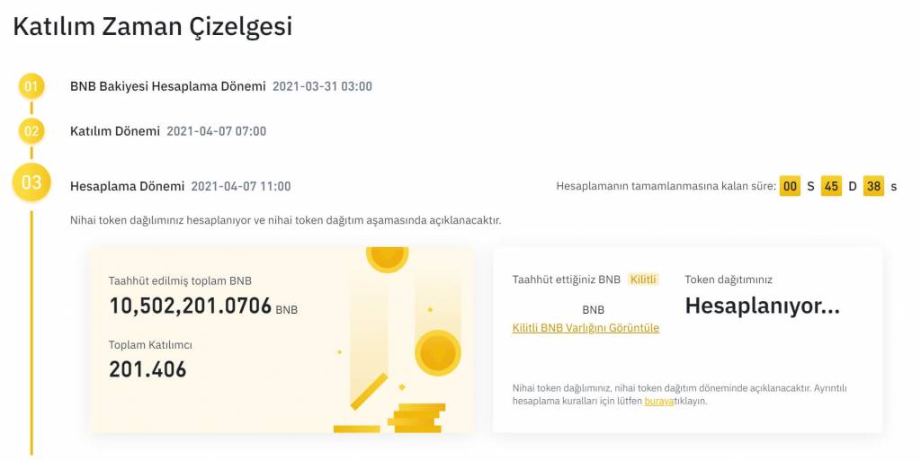 Gördüğünüz gibi Binance oldukça detaylı bir açıklama metni sunmuş. 19. Launchpad olan Tokocrypto Launchpad’ine tek katılma şartının 31 Mart yani bugün ile 7 Nisan 2021 tarihleri arasındaki 7 günlük sürede spot, marjin, pool ya da birikim hesabınızda BNB tutmak olduğu belirtilmiş, vurgulamam gereken tek yer sadece ICO’ya katılım günü olan 7 Nisan’da BNB’lerinizin taahhütnameyi imzalayabilmeniz için spot cüzdanınızda olması gerektiğidir.