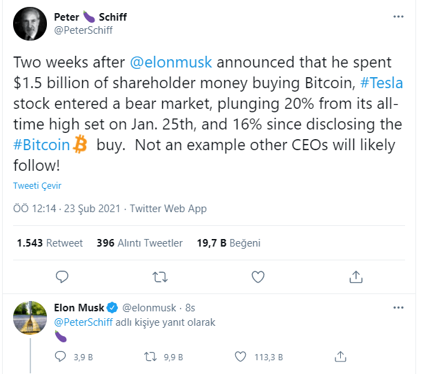 Peter Schiff ise Elon Musk’ın yukarıdaki tweet’ine karşılık olarak aşağıdaki tweet’i paylaştı.