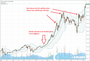 Şimdi burada bahsettiklerimizi Bitcoine ait sekiz aylık bir grafikte inceleyelim. Görüldüğü üzere bant dışına sert bir şekilde çıkan fiyatlar tekrar bant içerisine hızlı bir şekilde dönüş yapmışlar. Bandın daraldığı dönemlerde ise fiyatın trend değiştirdiği görülmektedir. (Bantların daralması ile birlikte gelen trend değişimlerinde düşen işlem hacmine dikkat edin)
