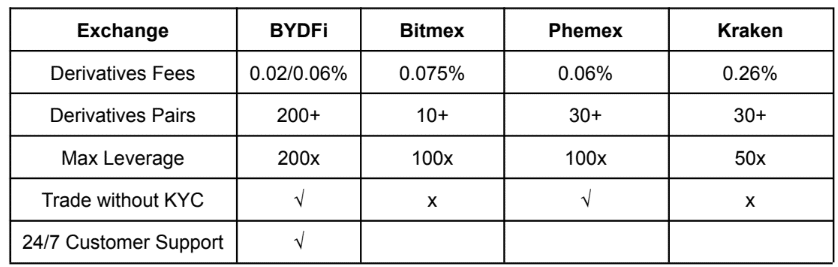 Yeni başlayanlar, demo alım satım özelliğiyle öğrenebilir ve gelişmiş işlem bilgisine sahip olmadan kopya işlem (copy trade) ile gelir elde edebilirler. BYDFi, Bitmex, Phemex ve Kraken gibi tanınmış kripto borsalarıyla karşılaştırıldığında belirgin şekilde öne çıkar.