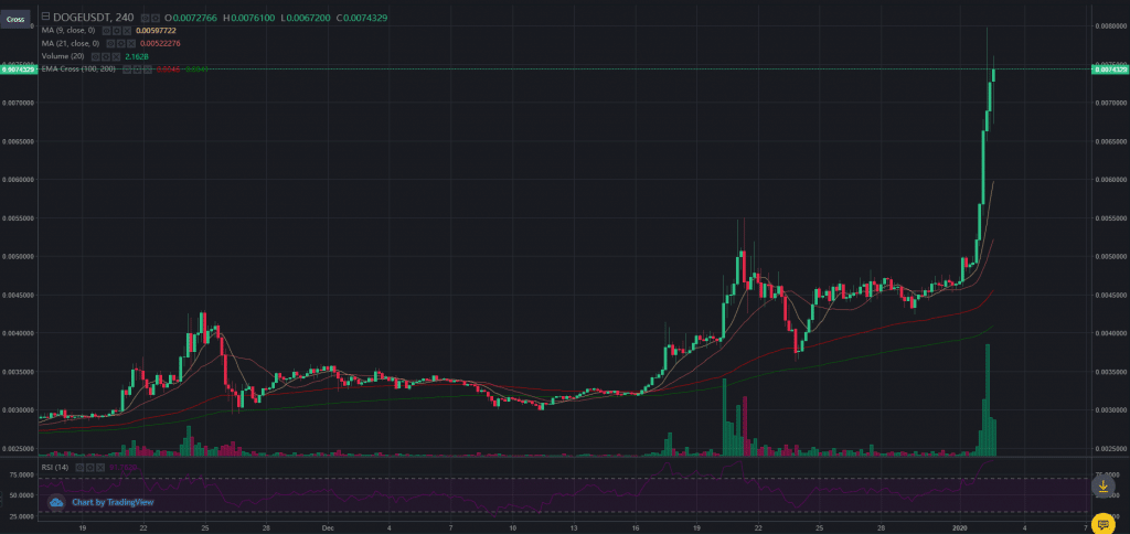 Dogecoin fiyatı, Bitcoin’in zirve yaptığı dönemde de artmaya devam etti.