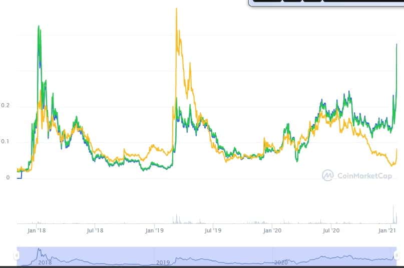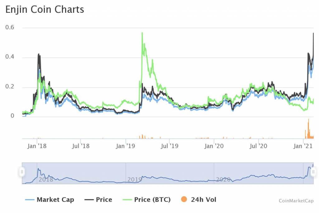Son günlerde yükselen NFT (non fungible tokens) akımı Enjin Coin’in de yelkenlerini dolduruyor. Aşağıdaki grafikte başarının resmini görüyoruz.