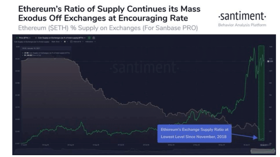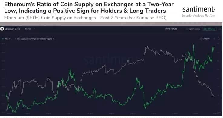 Güney Kore merkezli blockchain analist platformu CryptoQuant CEO‘su Ki-Young Ju, Mayıs 2020’den bu yana, kripto para borsalarında ETH rezervleri %20 oranında azalmış durumda dedi. Ju, ETH’lerin merkezsiz borsalara, stake kontratlarına ve şahsi cüzdanlara aktığını belirtti.
