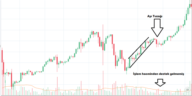 Bahsetmiş olduğumuz durumların örnekler üzerinden incelemesini gerçekleştirelim. Aşağıdaki ekran görüntüsünde yukarı yönlü bir trend mevcut fakat sonlara doğru fiyatların artık üst direnç çizgisine dokunmadığı görülüyor, aşağı yönlü bir kırılma gelebilir mi ? Yukarıda ayı tuzağı olarak ele aldığımız kavram burda karşımıza çıkıyor. Aşağı yönlü kırılma gerçekleşiyor fakat öncü göstergelerden biri olan işlem hacmi bu kırılmanın devam etmeyeceği sinyalini vermiyor. Devamında ise ufak bir düzeltme sonrası trend yukarı yönlü hareketini sürdürmeye devam ediyor.