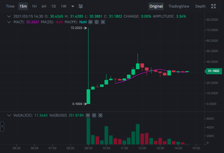 Binance 15 Mart 2021’den itibaren Alice tokenlarını listelemeye başladı. ALICE/BTC, ALICE/BUSD ve ALICE/USDT pariteleri üzerinden listelenme bugünden itibaren gerçekleştirildi.