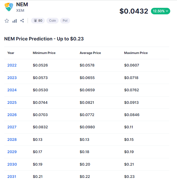 İşte, XEM coin için gelecek yıllarda beklenen ve öngörülen seviyeleri özetleyen tablo: